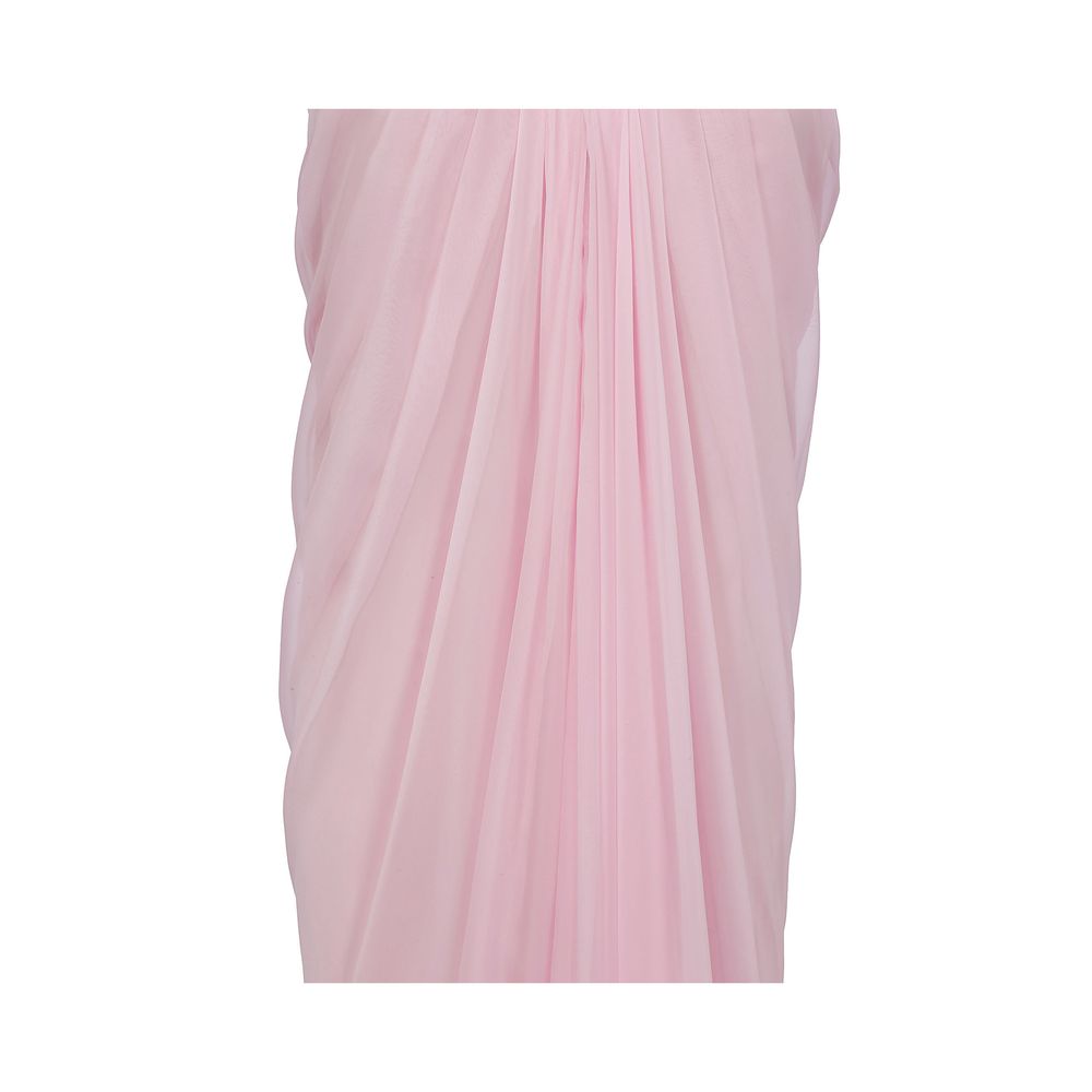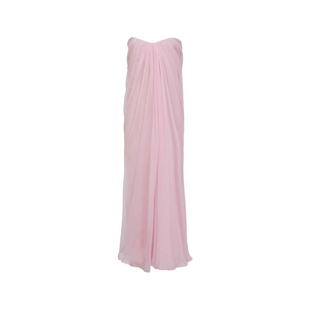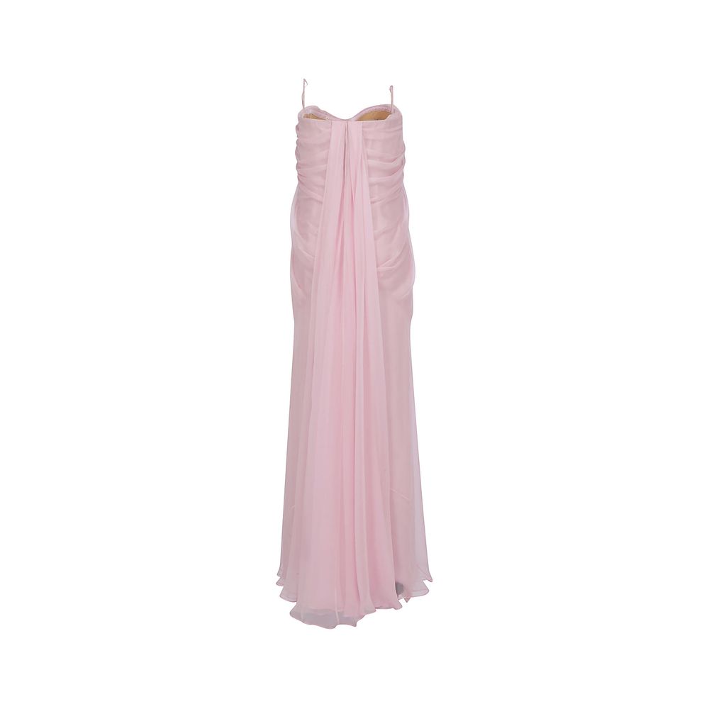 Pink Silk Long Dress by Alexander McQueen, back zip closure, volant texture, flared bottom hem, heart neck line.