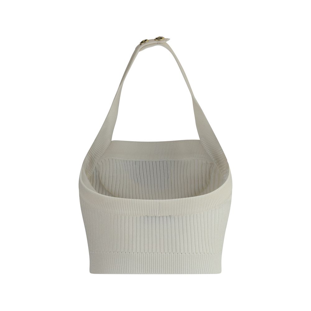 Balmain’s Top is a sleek and modern piece with a cropped pattern that enhances the figure. It features an American neckline and an embossed button closure, adding a touch of sophistication. The brand’s iconic monogram patch applied to the front highlights its authenticity and prestige. The ribbed design lends texture and structure, while the fitted fit emphasizes the silhouette in an elegant and sophisticated way.