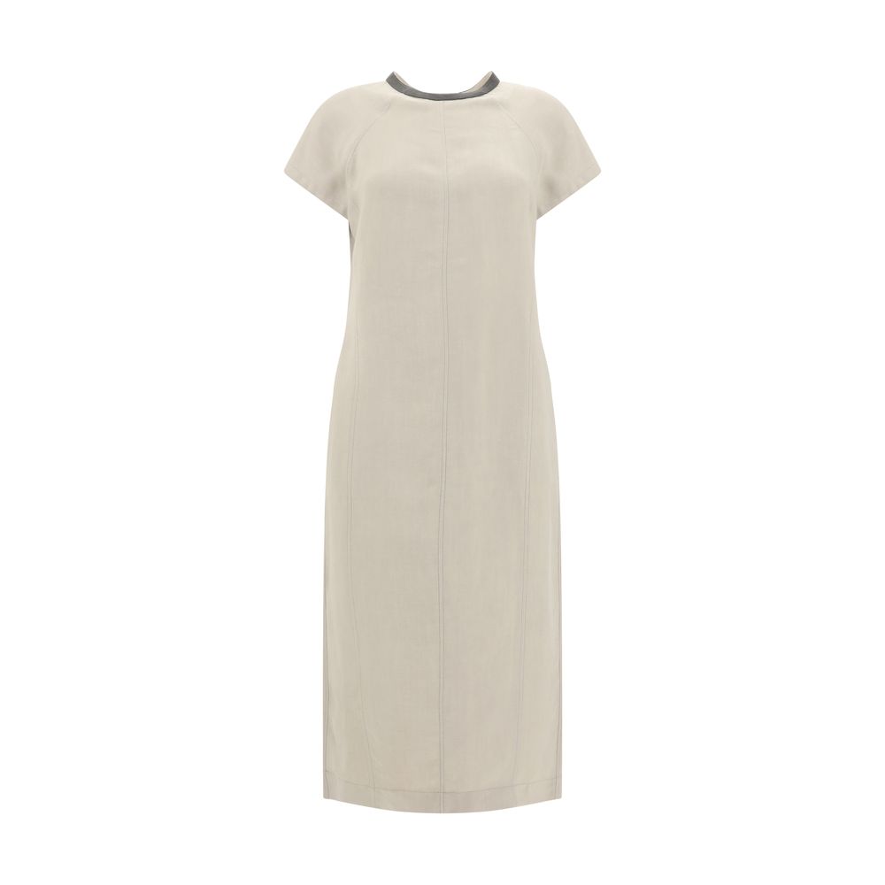 Brunello Cucinelli’s midi Dress features a short-sleeved design and a crew neckline. It features shiny jewels that decorate the garment, giving it a distinctive touch. The closure is positioned at the back with a zipper, while the bottom of the dress is embellished with a central slit. Two side welt pockets complete the design, offering practicality and functionality.