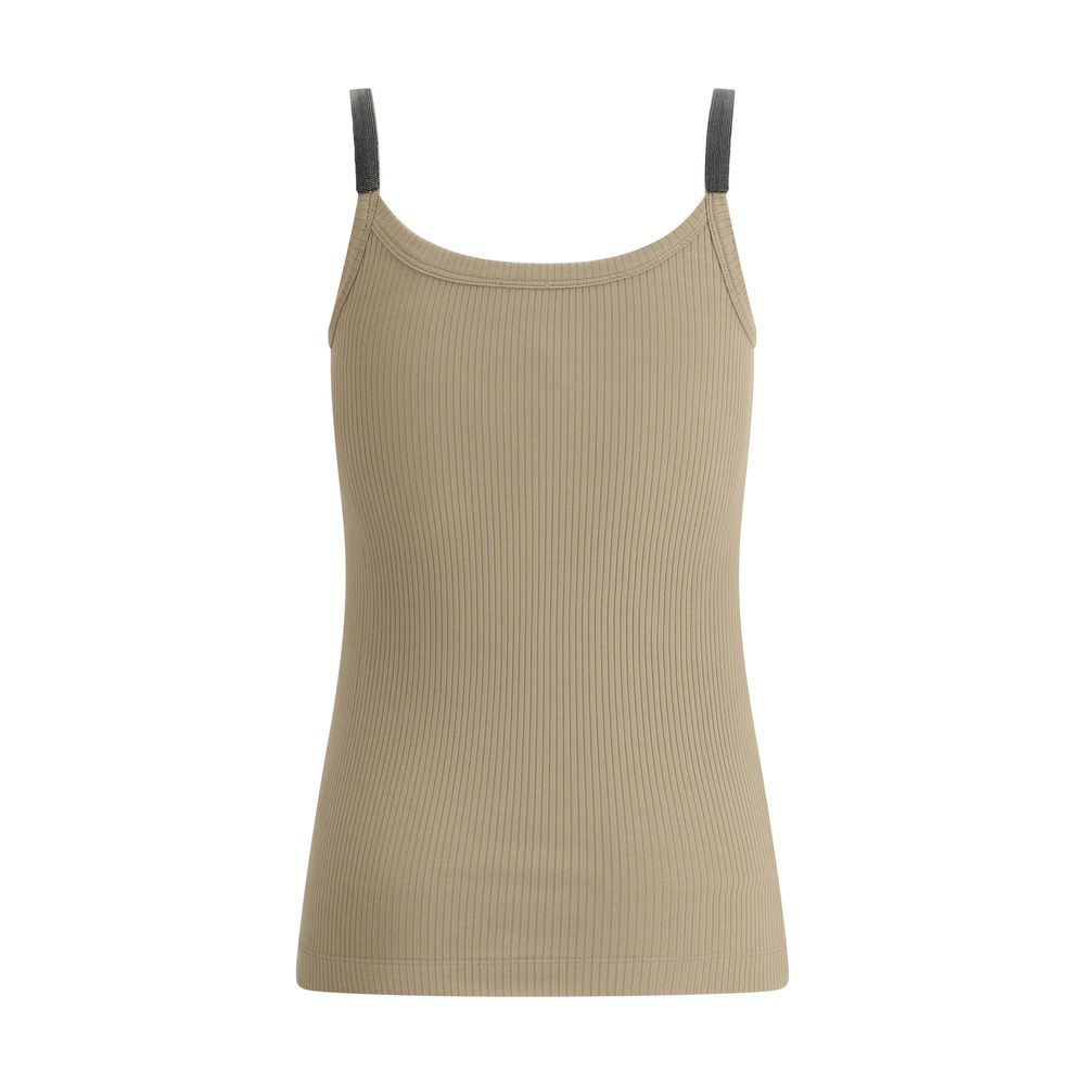 Brunello Cucinelli’s ribbed tank Top is an essential garment embellished with the house’s iconic details. Made of a ribbed knit that gently hugs the silhouette, it features a straight neckline and thin, elegant and feminine straps. Embellishing the design are the signature shiny beads applied along the straps, adding a touch of discreet and refined light.