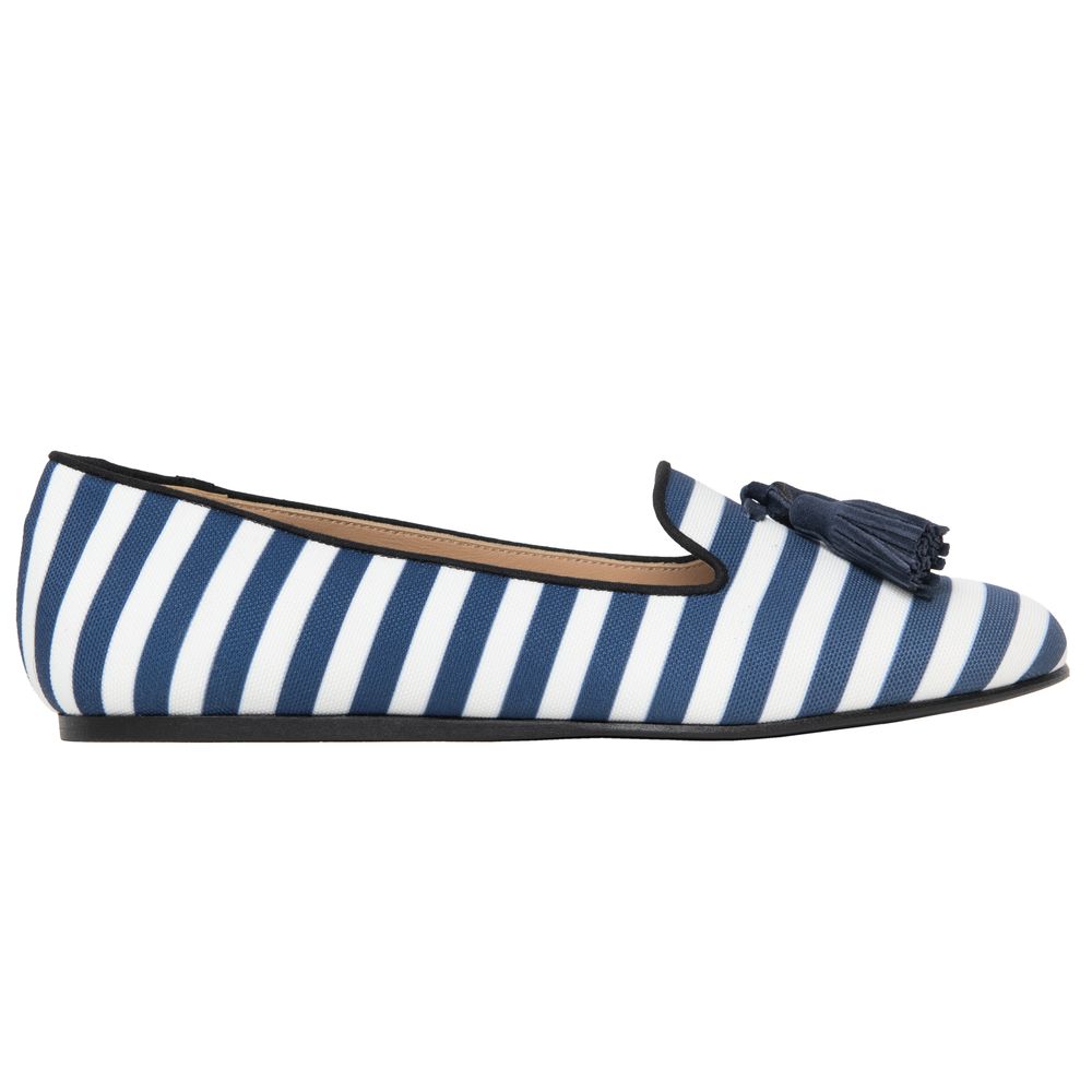 Charles Philip SHEILA TASSEL 5 moccasins in blue and white striped zebra print cotton, blue leather tuft on the front. Height: 10mm. Rubber sole. Leather lining and insole. Cotton edging. Internal cushion on the heel for maximum comfort. Designed and handmade in Italy. Unisex
