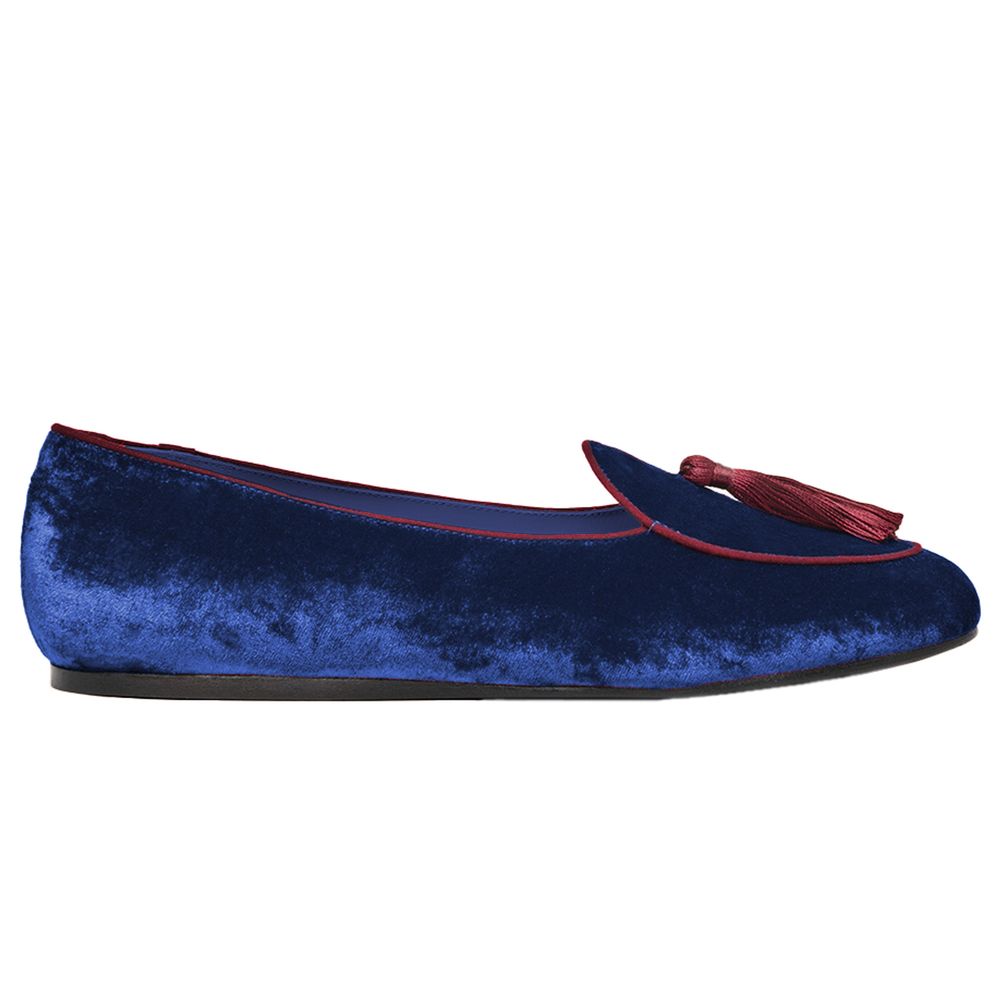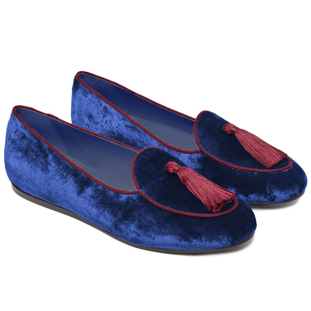 Charles Philip OLIMPIA moccasins in dark blue velvet, cotton tuft on the front and red edge details. Height: 10mm. Rubber sole. Leather lining and insole. Cotton edging. Internal cushion on the heel for maximum comfort. Designed and handmade in Italy. Unisex