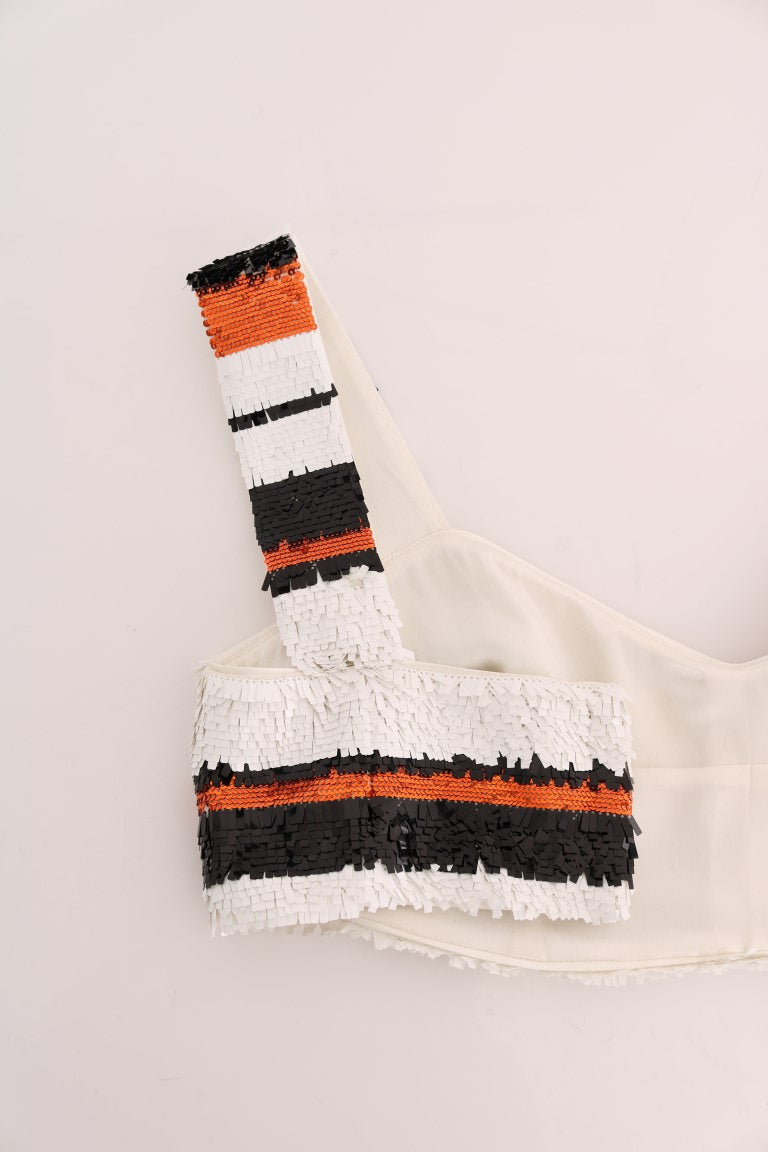 Step out in stunning style with this eye-catching Sequined Bustier Top from Dolce & Gabbana. Perfect for making a statement, this top is brand new with tags and exudes authentic Italian craftsmanship. With a multicolored design featuring white, orange, and black hues, it’s sure to turn heads wherever you go. The zipper closure ensures a snug fit, while the luxurious white silk stretch lining offers unparalleled comfort.