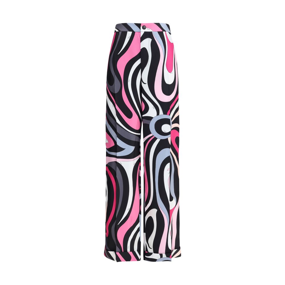 Pucci’s Marble print Silk Pants combine elegance and personality in a sophisticated design. Featuring a high waist and straight leg with turned-up hems, they have a center front pleat and side welt pockets that enhance their structure. Embossed piping and a zip-and-button front closure add sartorial details, while the iconic Marmo print wraps the fabric with flowing lines and vibrant colors, the perfect expression of the house’s unmistakable style.