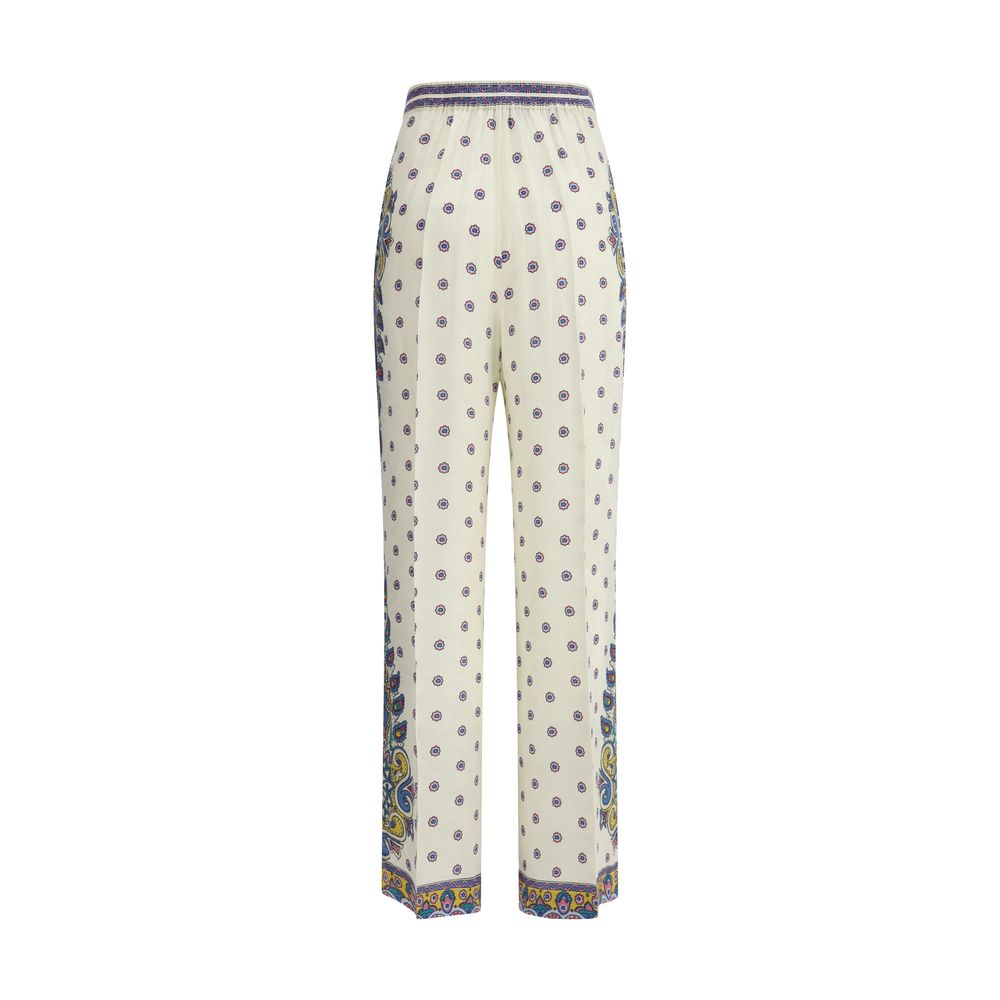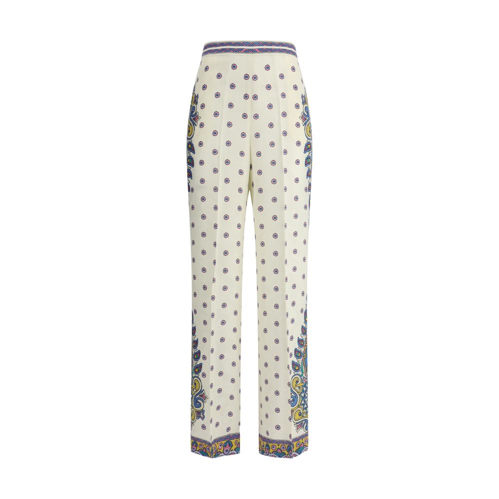 Etro’s Silk Paisley Print Pants are a masterpiece of elegance and originality, perfect for those who love a sophisticated yet bold style. The high-waisted cut slims the figure, while the straight leg gives an elegant and flowing silhouette. The side zipper closure ensures a perfect fit without compromising the design aesthetic. The all-over paisley pattern is a distinctive interpretation of the classic motif, adding a touch of color and movement to the garment. Made of high-quality silk, these pants are ideal for refined daytime or evening looks, easily paired with blouses or elegant jackets for a sophisticated, on-trend outfit.
