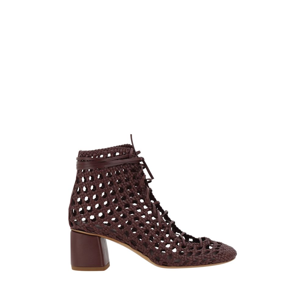 Forte_Forte’s Chic leather Ankle Boots are a perfect blend of elegance and modernity. The round toe gives a classic look, while the mesh design adds a light and original touch. The front closure with crossed laces ensures an adjustable and secure fit, while the wide leather heel offers stability and comfort. The logoed insole enhances the design with a distinctive brand detail.