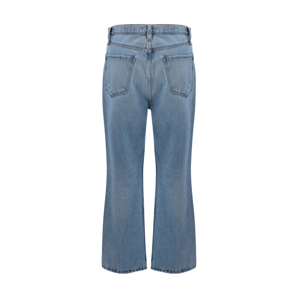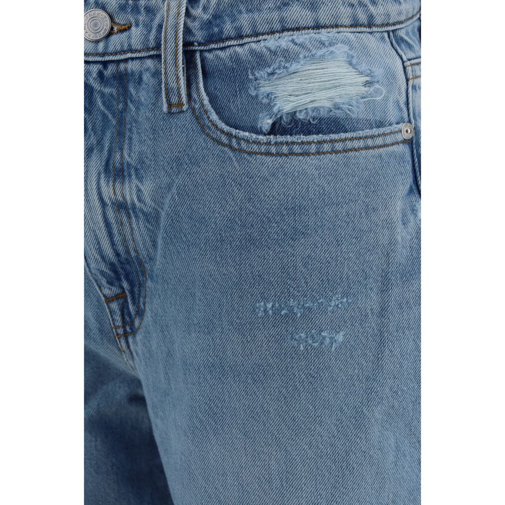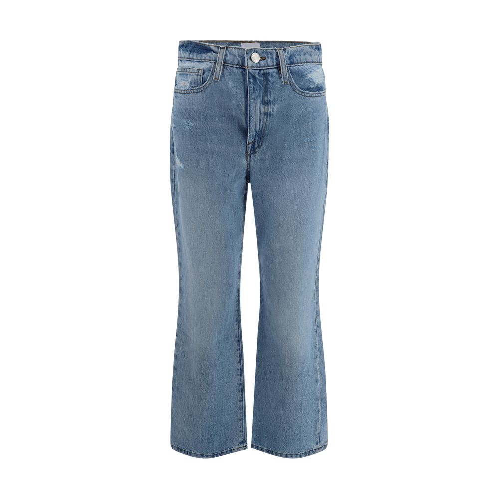 Cotton Le Jane Ankle Jeans by Frame, five-pocket wide-leg style, front button and zipper closure, waistband loops, vintage effect design with frayed details.