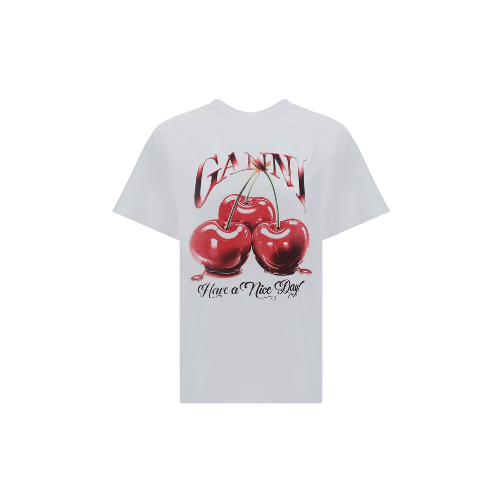 Cotton Cherry Relaxed T-Shirt by Ganni, ribbed crew neck, maxi print with iconic brand monogram contrasting on front, monochrome pattern, regular fit.