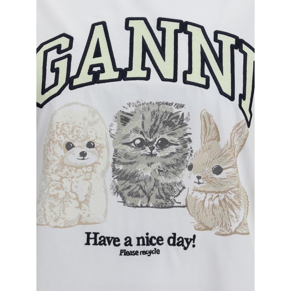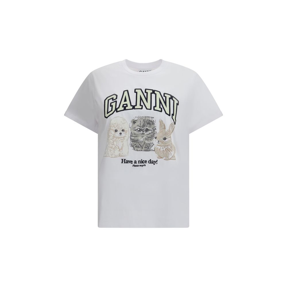 Ganni’s "Have a Nice Day" T-Shirt combines style and environmental commitment. With its ribbed crew neck and front print depicting smiling animals accompanied by the phrase "Have a Nice Day, Please Recycle," it is the perfect garment for fashionistas with a positive message. Made of soft cotton, it lends an ironic and conscious touch to everyday looks.