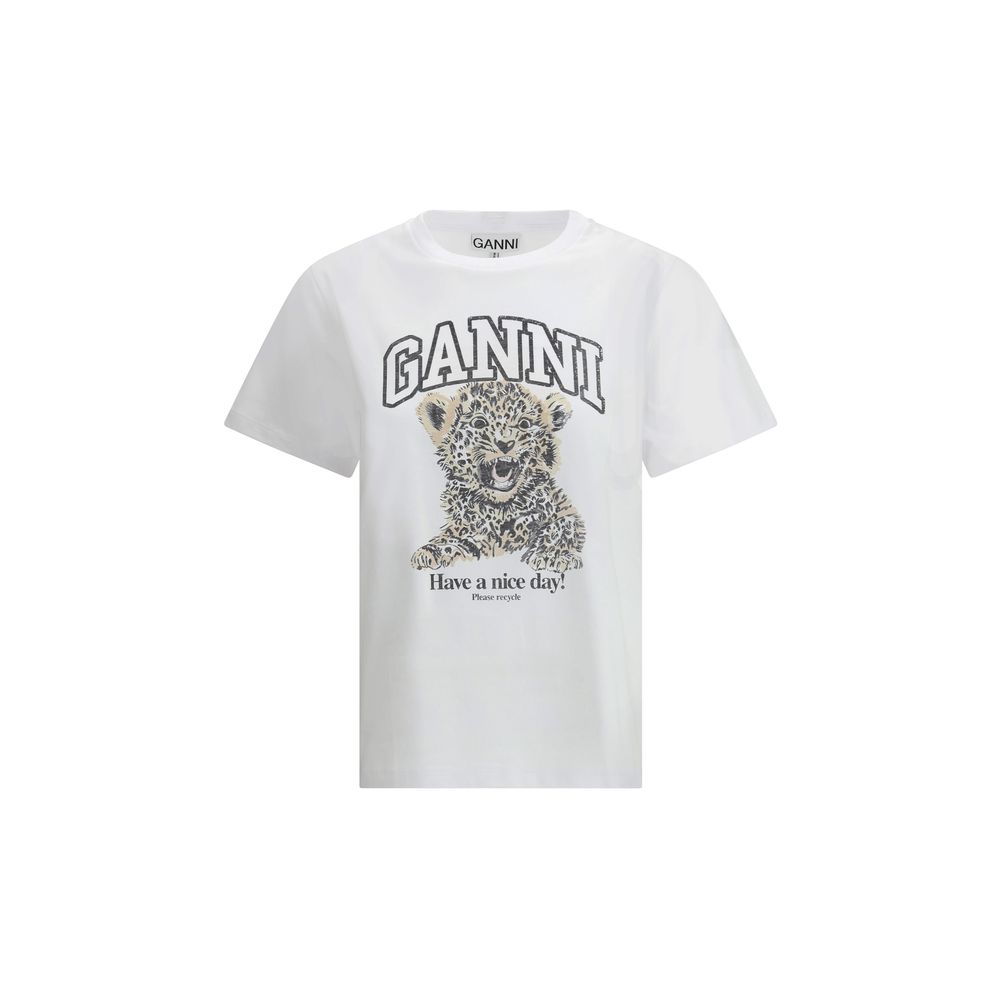 Cotton Leopard T-Shirt by Ganni featuring ribbed crew neck, maxi print with iconic brand monogram contrasting on front, monochrome pattern, regular fit.