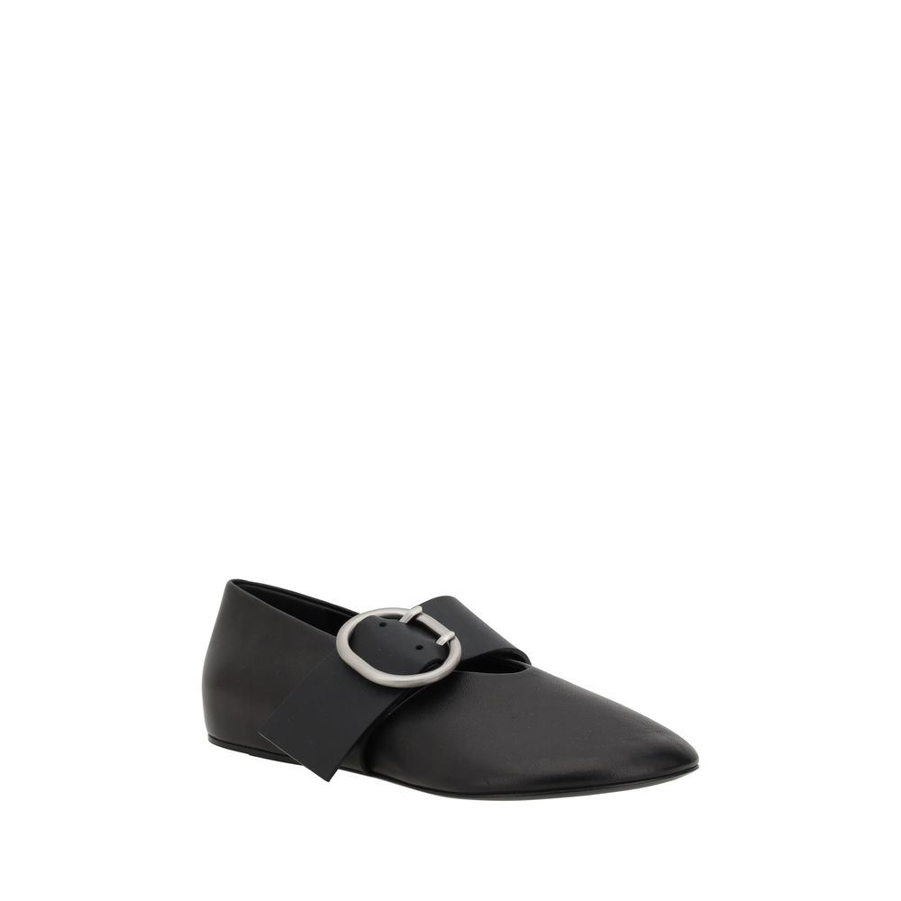 Jil Sander’s leather Ballerinas feature an elongated toe and a refined design. The flat sole ensures comfort and versatility, while the contrasting wide applied buckle closure on the front adds a distinctive and modern touch. The contrasting branded insole completes the minimalist and elegant aesthetic, making these ballet flats ideal for a sophisticated and chic look.