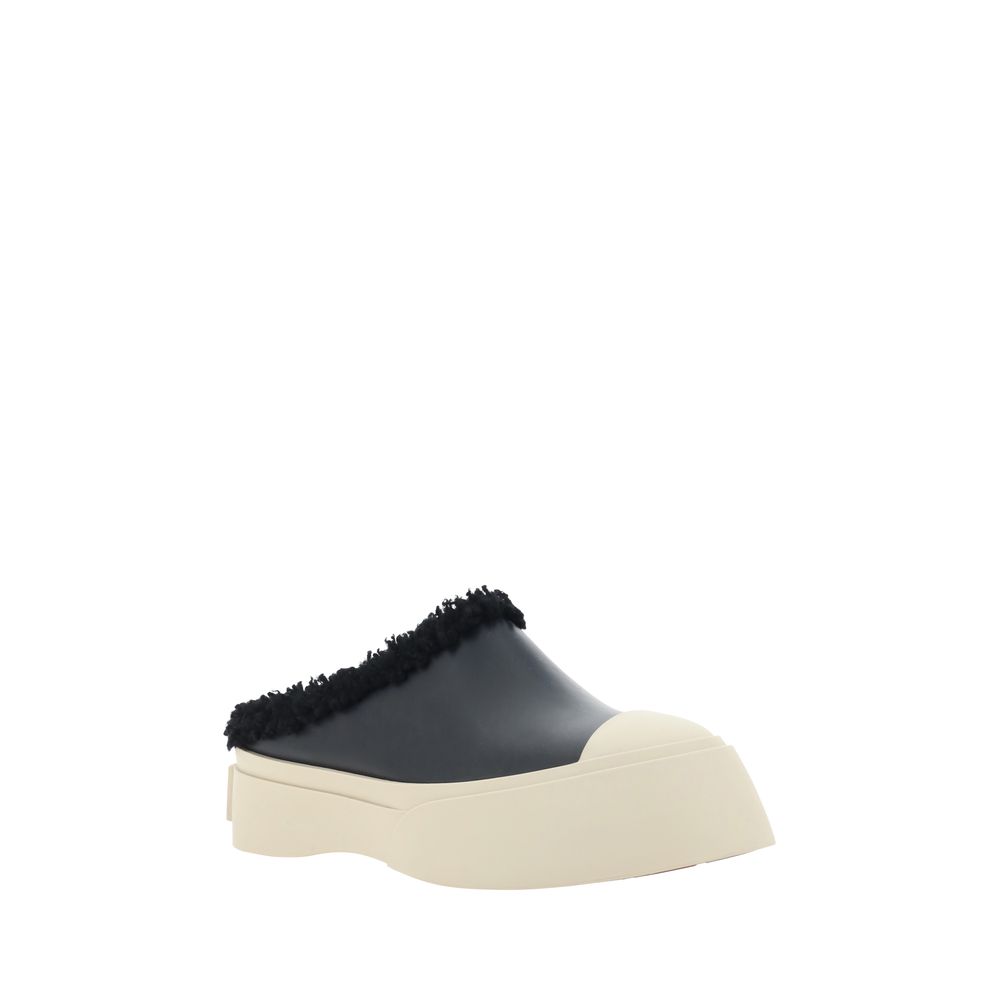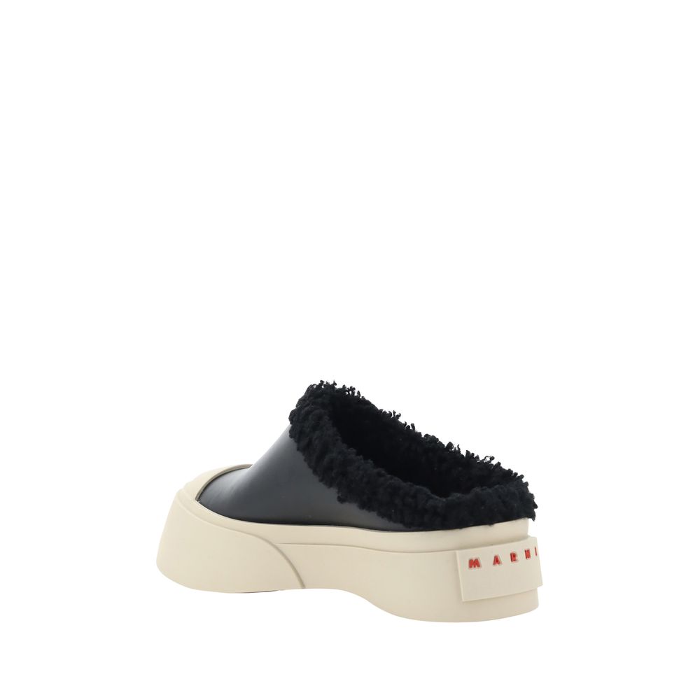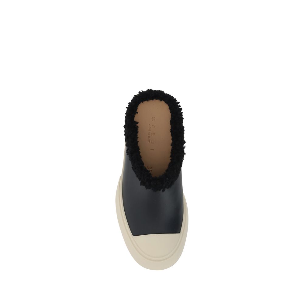 Leather Mules by Marni, slip-on style, faux fur detail around ankle, rubber and embossed logo patch applied at heel, contrasting reinforced sole.