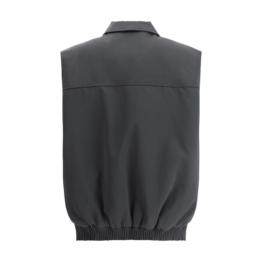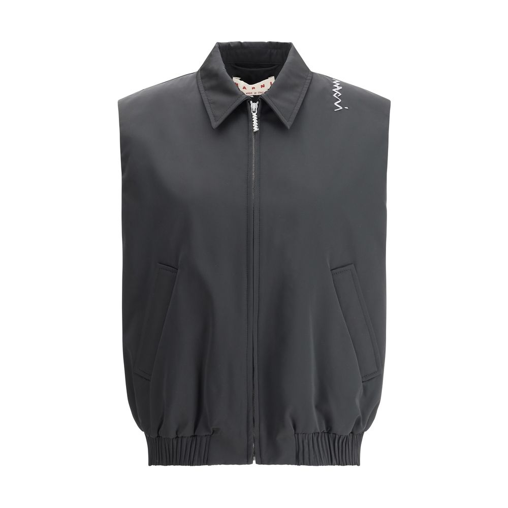 Marni’s padded vest combines comfort and style with a stylish and functional design. Featuring a classic collar and a logoed zipper closure on the front, it offers practicality without sacrificing aesthetics. The two welt flap pockets on the front and the elastic hem add a touch of practicality, while all-over padding provides warmth. A distinctive touch is provided by the brand’s iconic monogram sewn on one shoulder. A garment that combines minimalism and high quality.