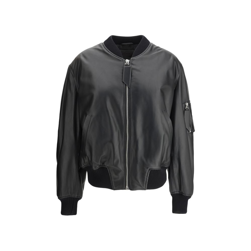 Leather Anja Bomber Jacket by The Attico, ribbed collar, front zipper closure, wide sleeves, zippered patch pocket on left sleeve, ribbed cuffs, ribbed hem, oversize fit.